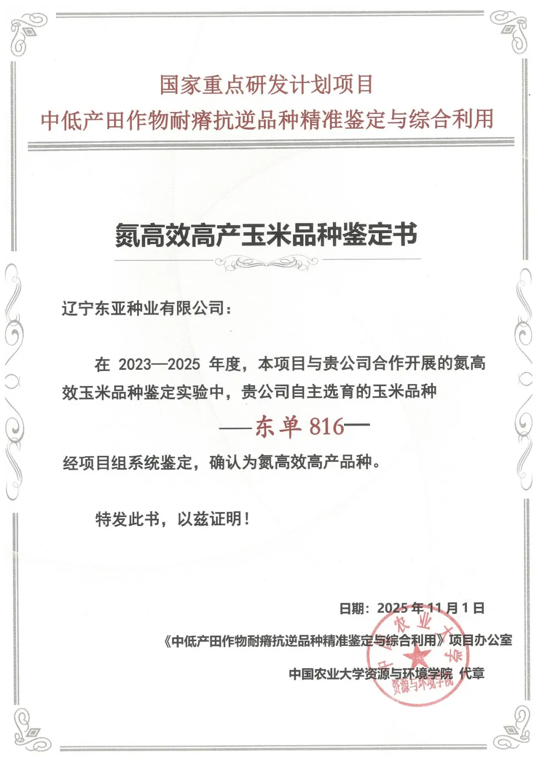 春啟農時,良種先行;科技興種,實干踐責。近日,遼寧東亞種業有限公司自主培育的玉米品種東單816,經中國農業大學權威鑒定,正式確認為氮高效高產品種。這一成果既是東亞種業深耕科研育種、堅守“科技興種、良種惠民”使命的生動實踐,也是公司在綠色種業發展道路上的重大突破,為我國玉米產業減肥增效、高質量發展注入強勁動能。